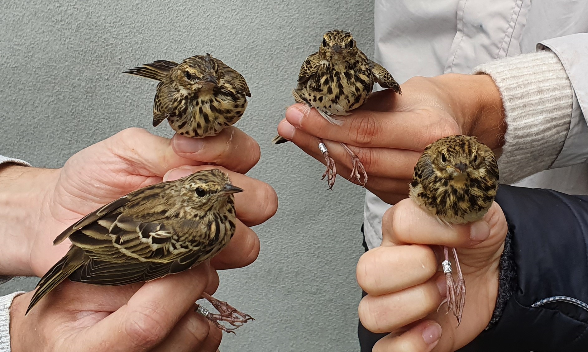 Fire af dagens fem Skovpibere til ringmærkning røg i samme net. Foto: Isabel Hunter