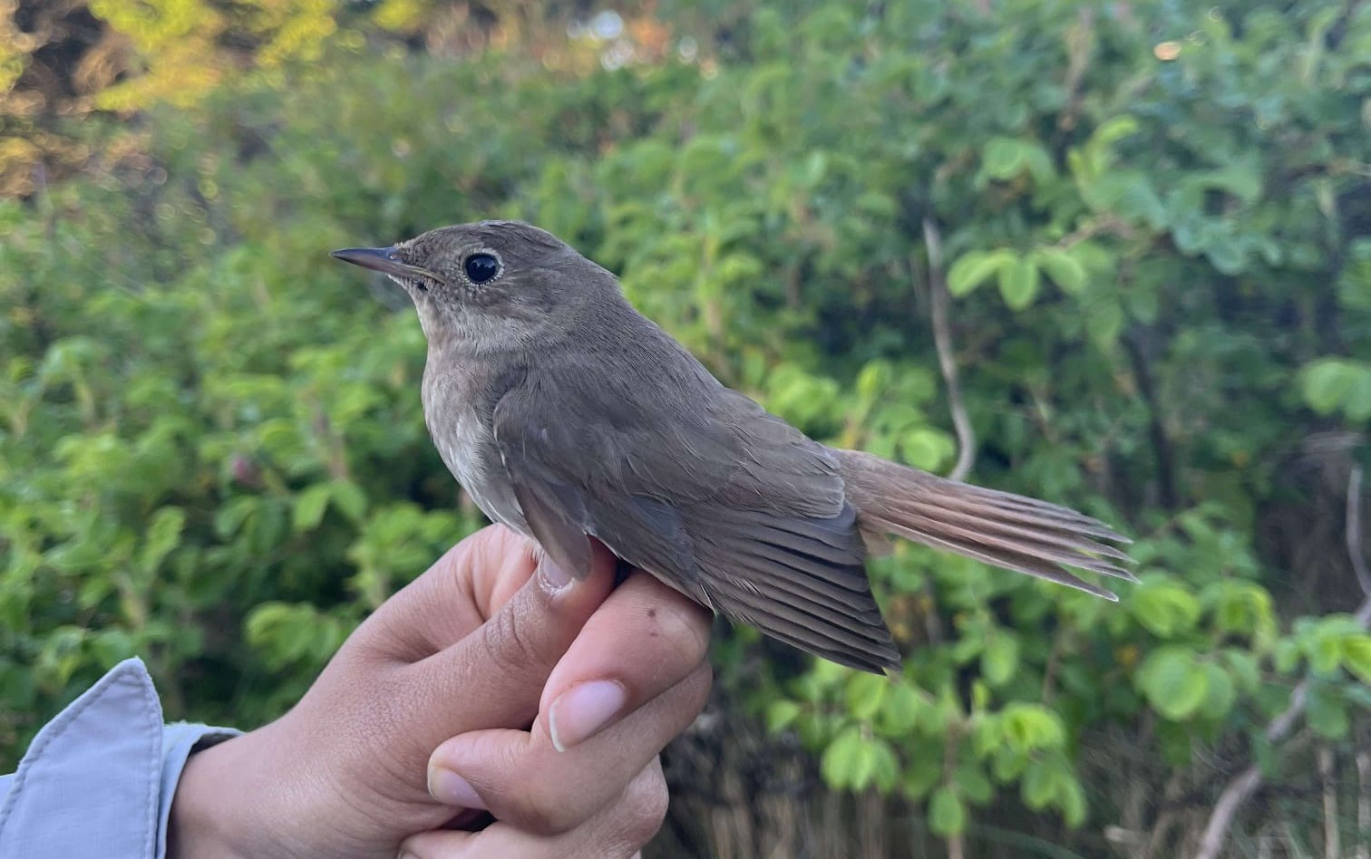 It was a slow morning with more walking than work at the nets or in the lab. But there was also a surprise in the net, we caught a Thrush Nightingale “Nattergal”.