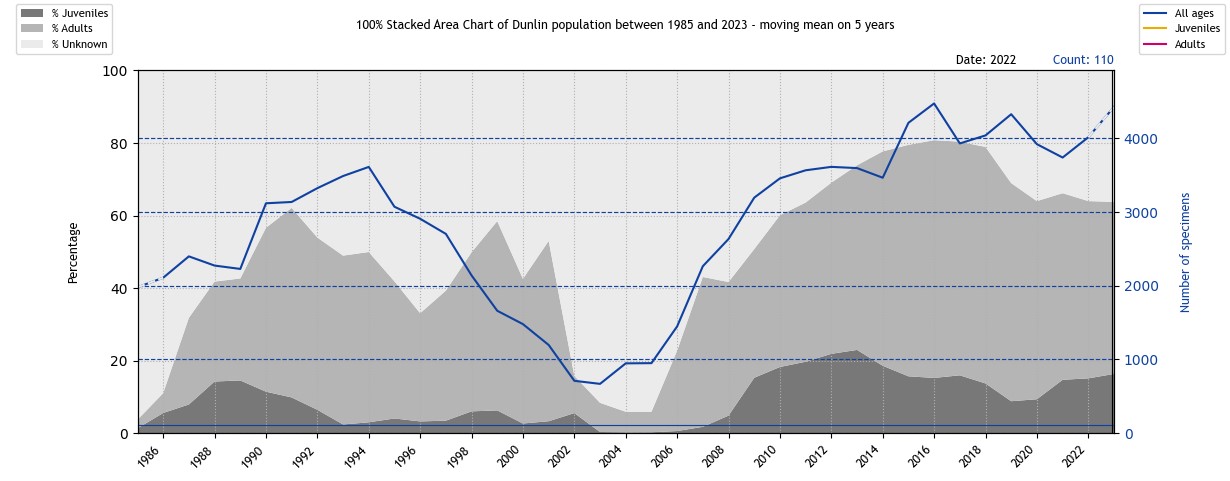 I sommeren 2024 lavede en fransk studerende (Theotim Le Camus) et stærkt værktøj til os, som kan identificere data indenfor standardtiden og lave "moving means" på totaler og de aldersbestemte fugle. Det kan f.eks. bruges til at se ungfugleprocenter på vores trækkende vadere og glatte kurverne ud over tid. Man kan også aflæse værdierne direkte i graferne.